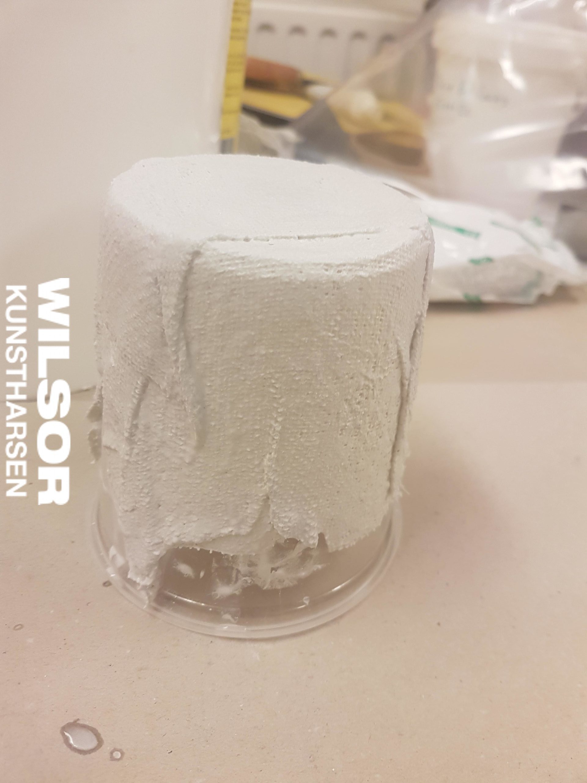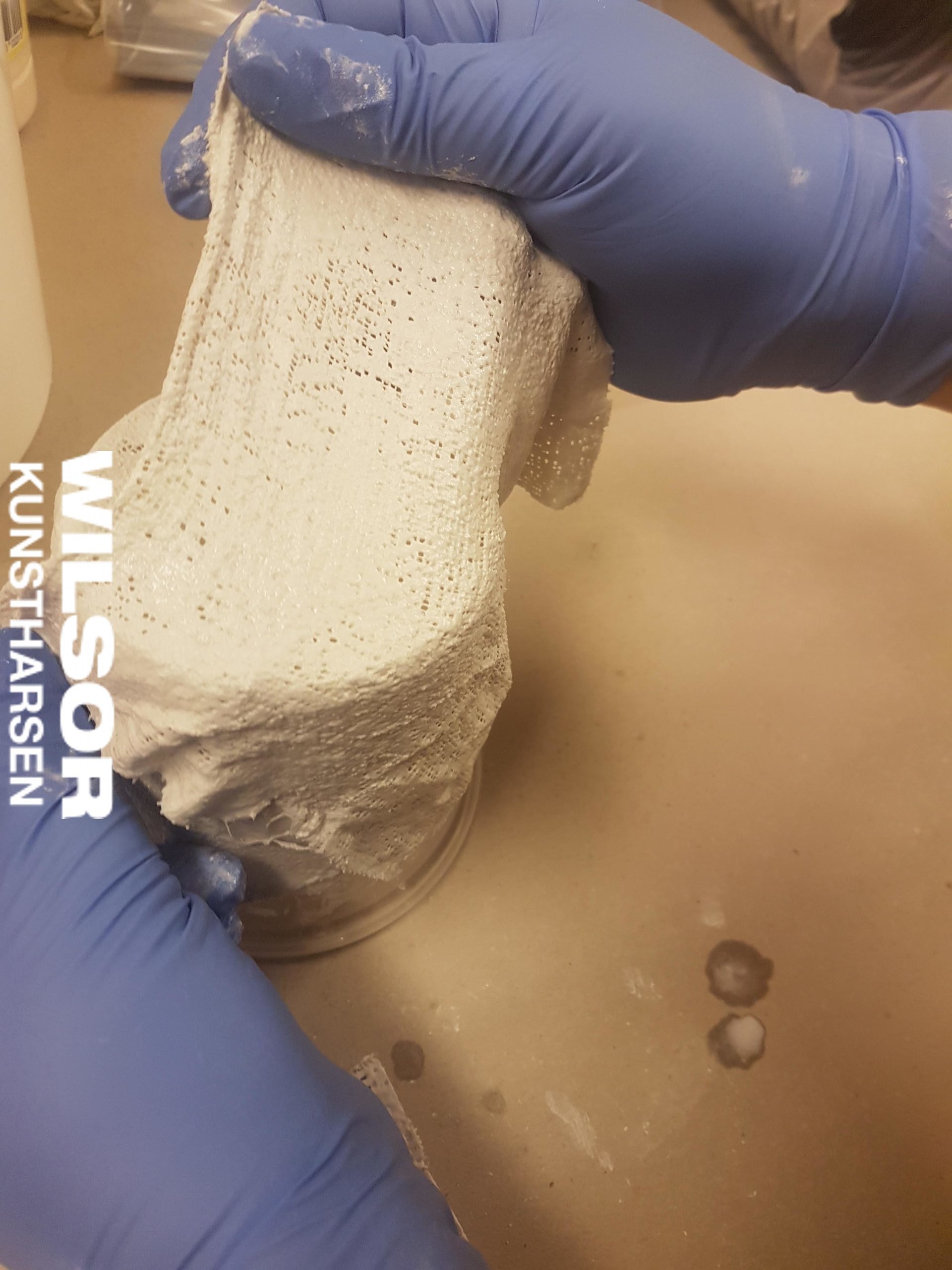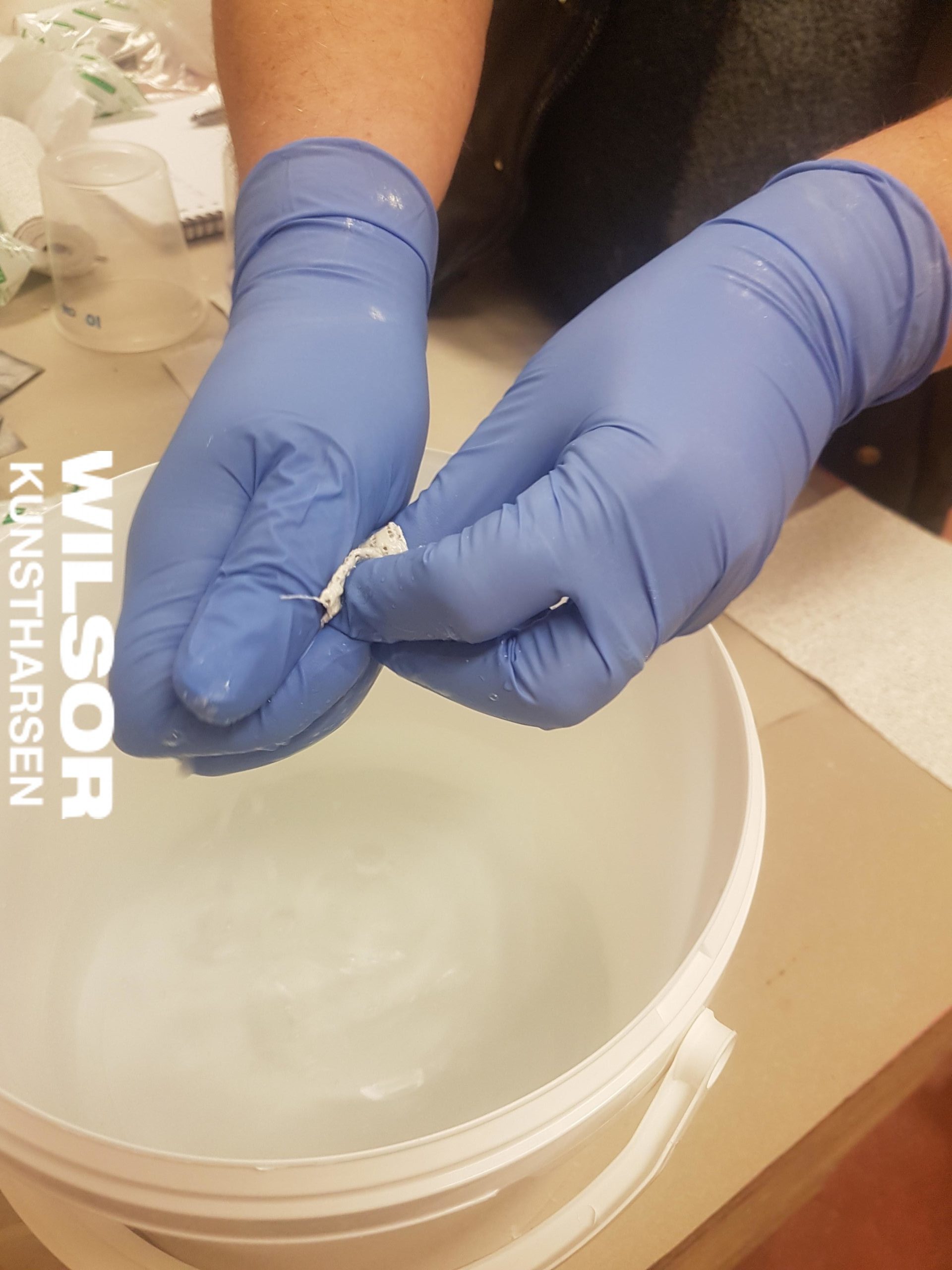 Door deze lijmende eigenschappen van het gips met plastic vloeistof zal, zonder losmiddel, de steunmal erg vast aan een latex mal komen te zitten (siliconen mallen geven geen probleem). Gebruik hiervoor ons speciaal losmiddel, of benat het eerste gipsverband met water, en ga dan pas verder met plasticvloeistof.