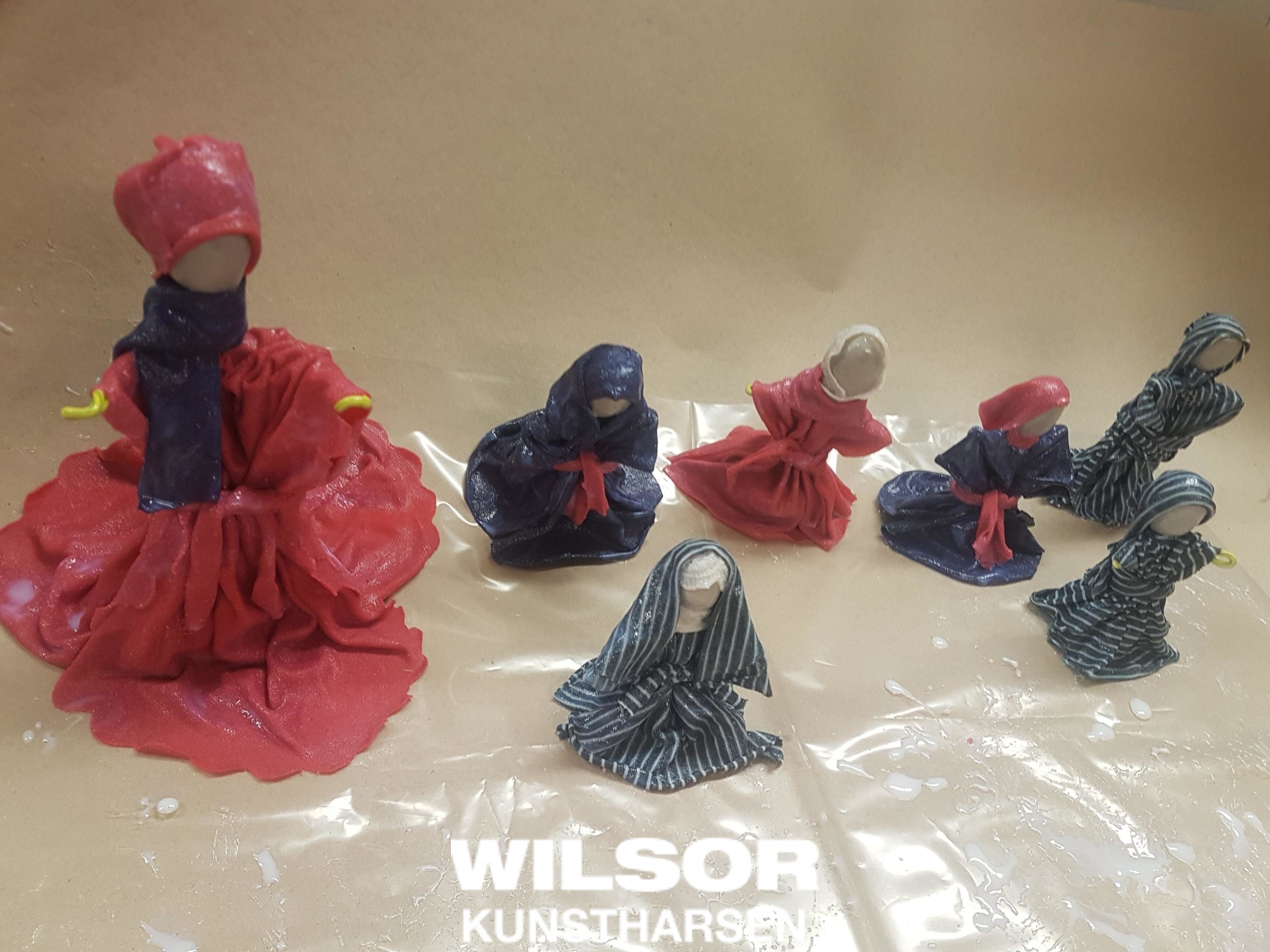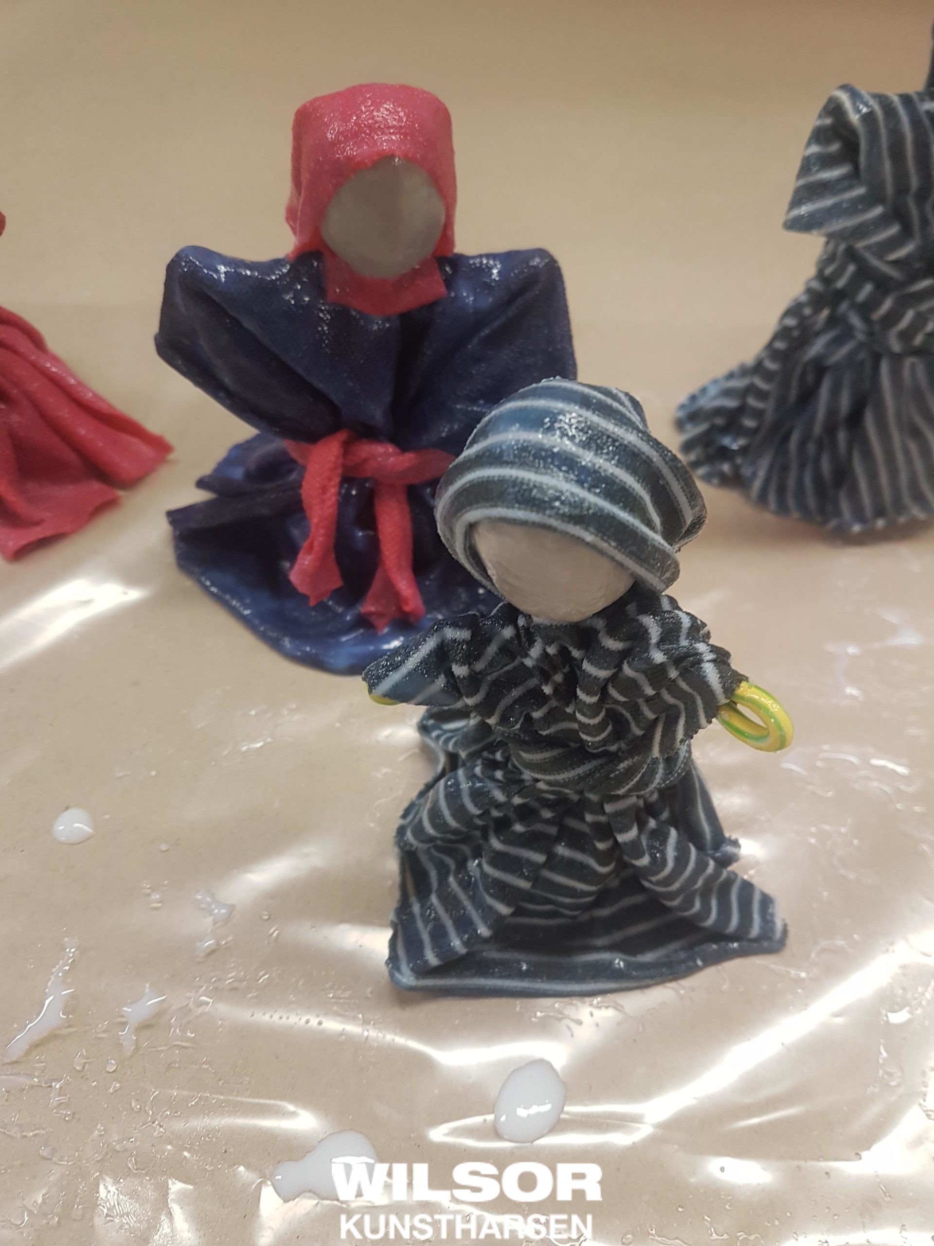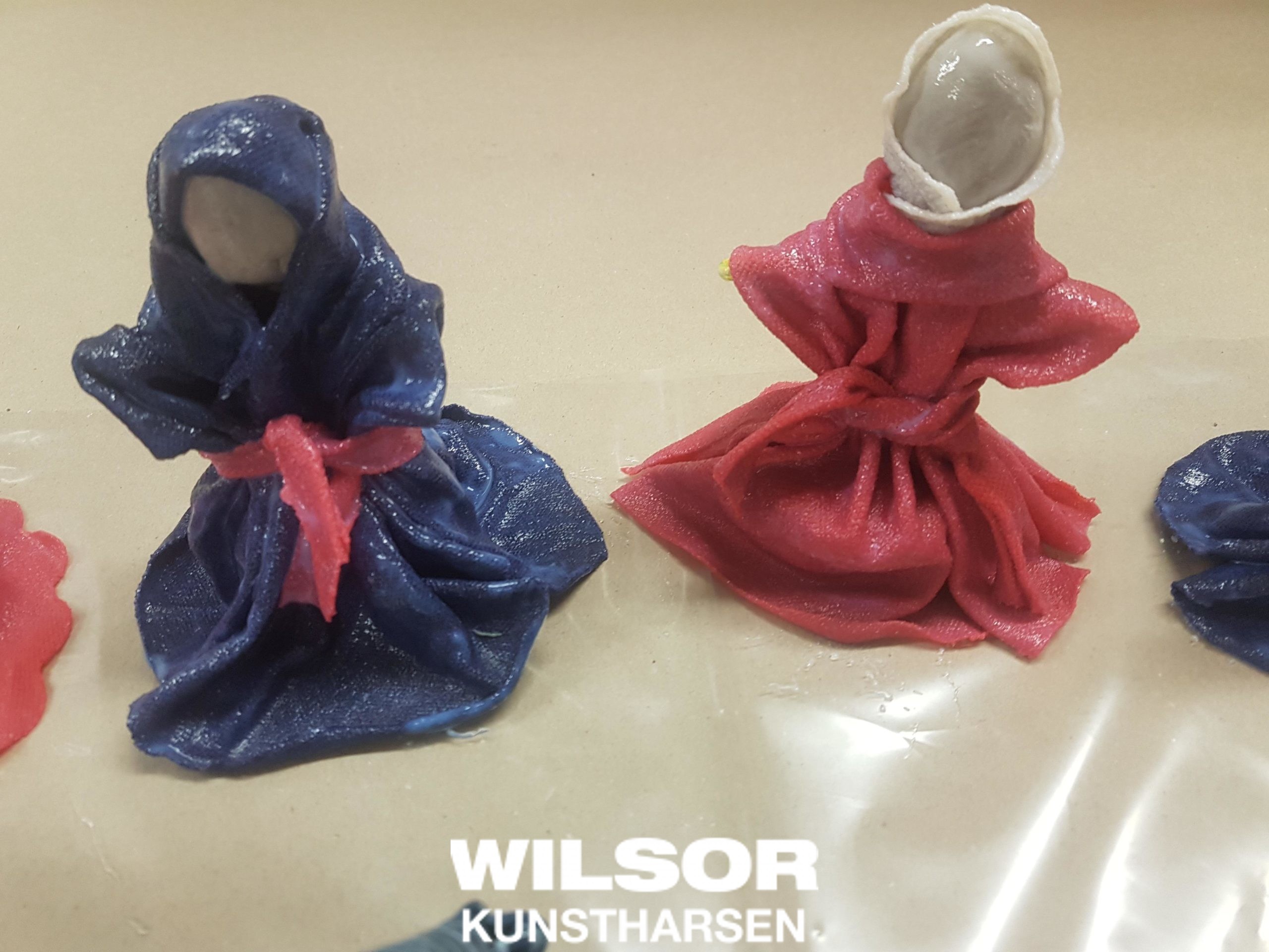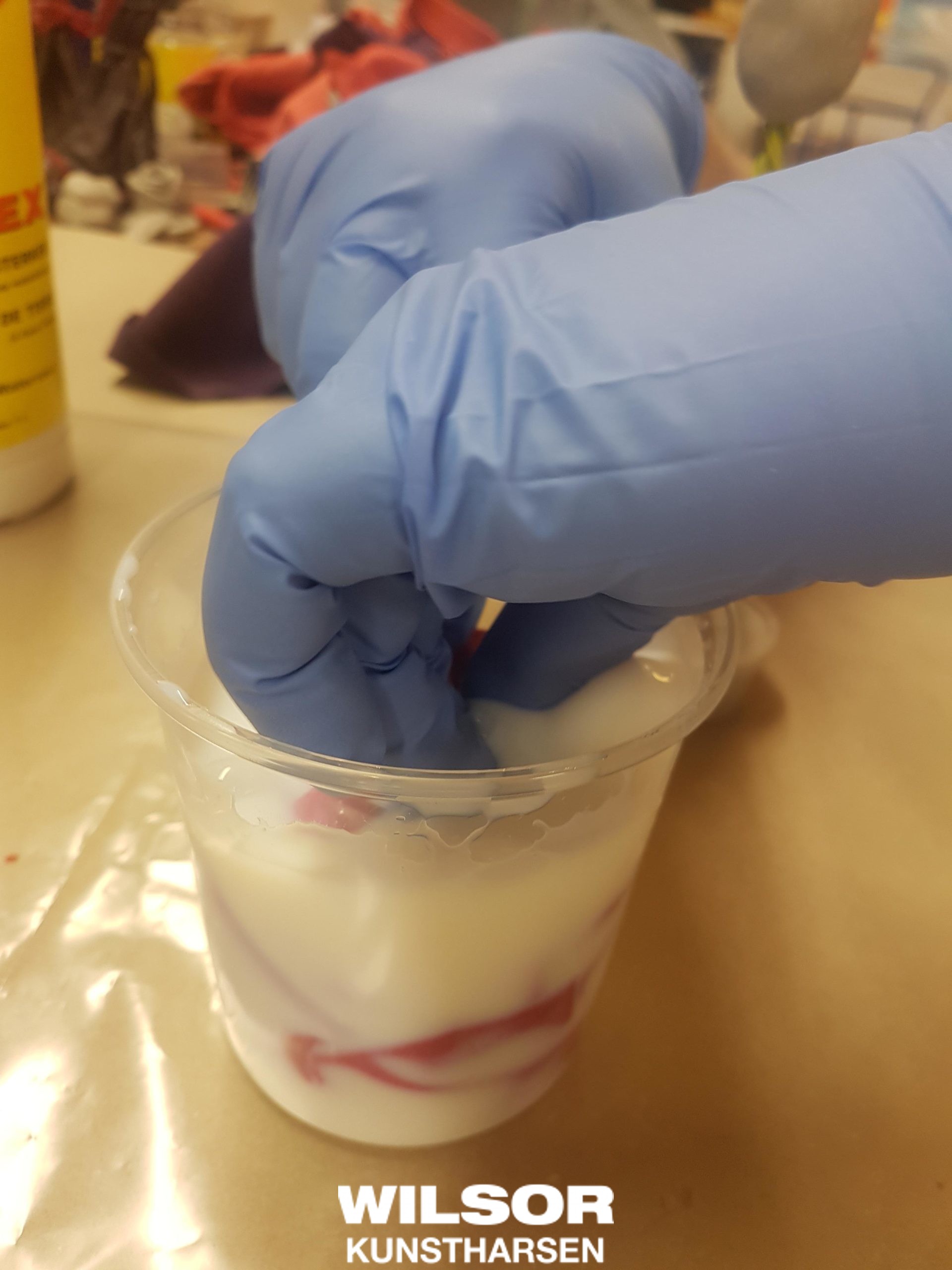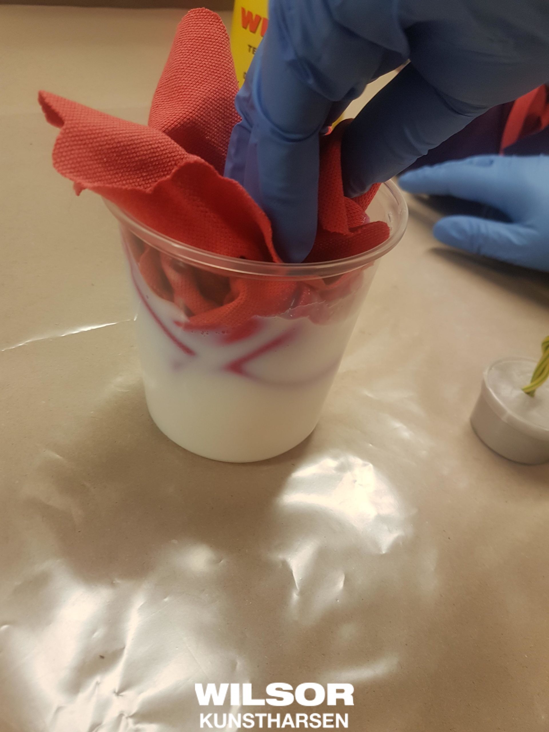 Doop de kledingstukken enige keren in het Wiltex mengsel en laat het overschot eruit druipen of wring de kledingstukken enigszins uit. Vermijdt zoveel mogelijk het ontstaan van luchtbellen. Zitten er toch teveel luchtbellen op het kledingstuk dan kan men ze laten openspringen door er even met een warme föhn overheen te blazen, voordat ze gedroogd zijn.
